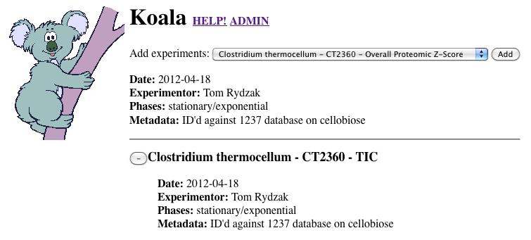 Summary: Research groups often wish to visualize their proteomic, transcriptomic, and microarray data overlaid onto the corresponding metabolic pathways. The SRI-developed BioCyc Pathway Tools software suite provides many ways to do this, including Omics Viewer and Cellular Overview. Koala is a web-based BioCyc Pathway Tools-compatible plug-in designed to complement this by enabling researchers and workgroups to overlay their experiment data on any Pathway Tools visualization while sharing, storing, and managing their data. Koala also provides a system to collect and manage experimental metadata in a publication ready format.