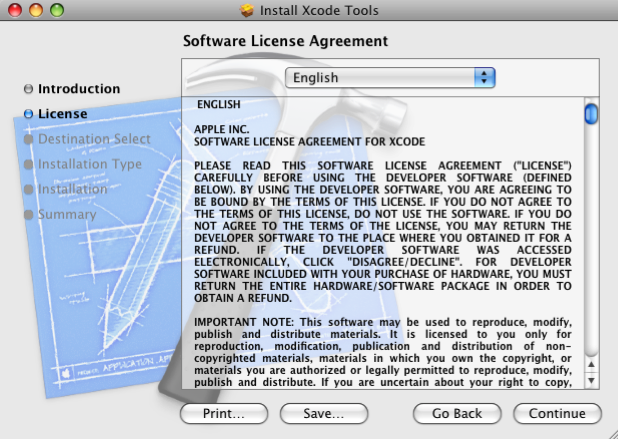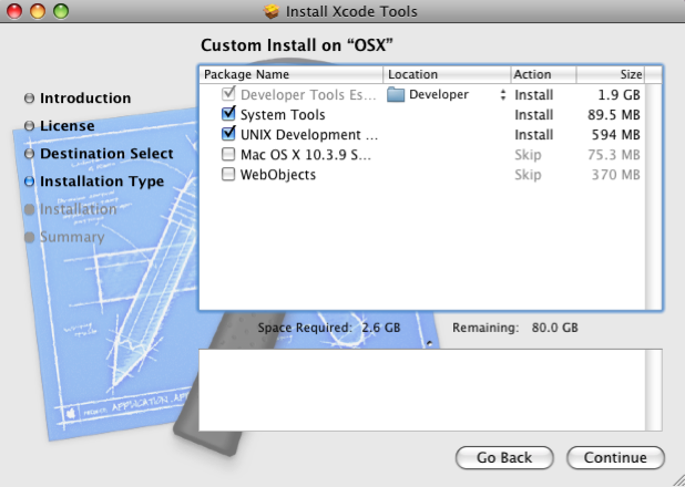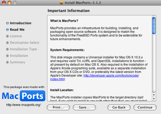 Download and install XCode (you may need to register to download XCode). Alternatively, you may install XCode from your Apple OS X CD or DVD. NOTE: if you are downloading XCode, make sure that you download the correct version. If you are running OS X Snow Leopard, download XCode 3.2.2, if you are running OS X Leopard, download XCode 3.1.1. Please note that XCode is easily found on the MacPorts website (which we need anyways), hence I have used that website as a reference for finding XCode.