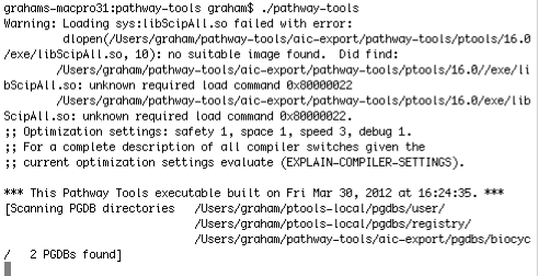 Restart pathway tools. NOTE: you may still receive an error regarding libScipAll.so, if you are using OS X 10.5 (Leopard). Please disregard this error, as there is nothing we can do about it at the present time; additionally, no loss of stability has been observed by this error by our group at the time of this writing - August 31, 2012.