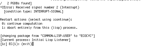 If Pathway Tools is running, close it either properly, or hold the "control" key while you press the "C" key repeatedly until you get a prompt similar to EC(1), then let go of the "control" key (and stop pressing the "C" key), then type: