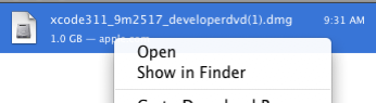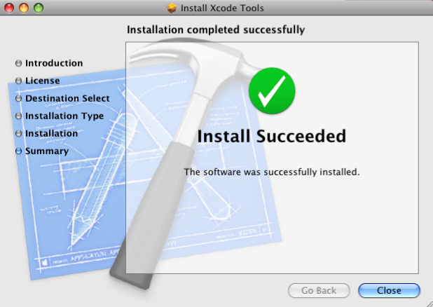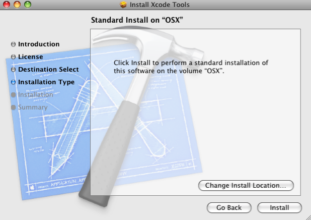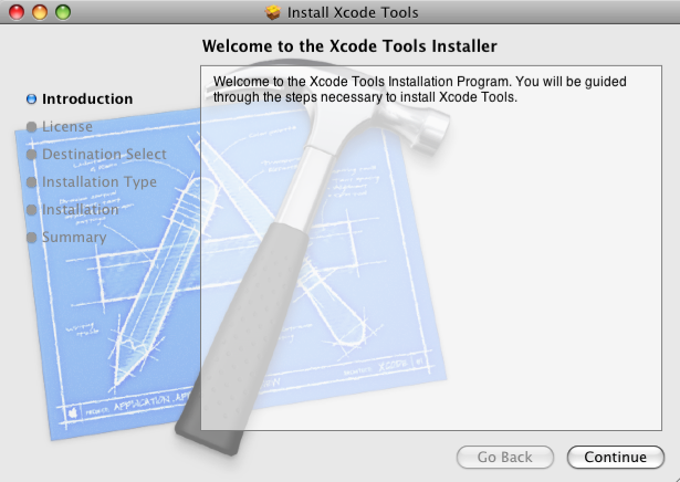 Open the XCode installer file (the screenshots show how to do this if you have downloaded XCode: hold the "control" click on the DMG file, then let go of the "control" key and click on "open", then open XcodeTools.mpkg in the window which pops up).